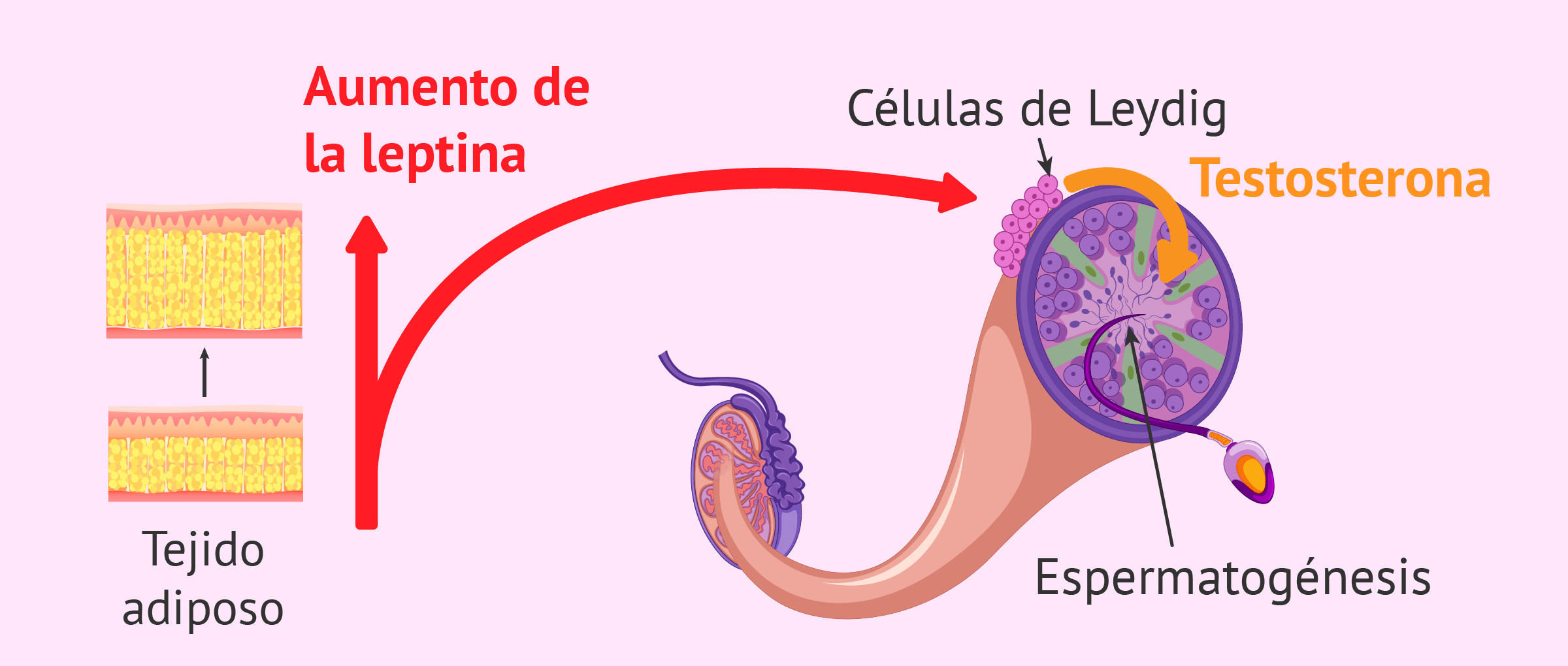 La causa de la disminución de testosterona en las células de Leydig es la alta producción de leptina en las células del tejido adiposo, ya que los hombres obesos tienen una mayor población de estas células.