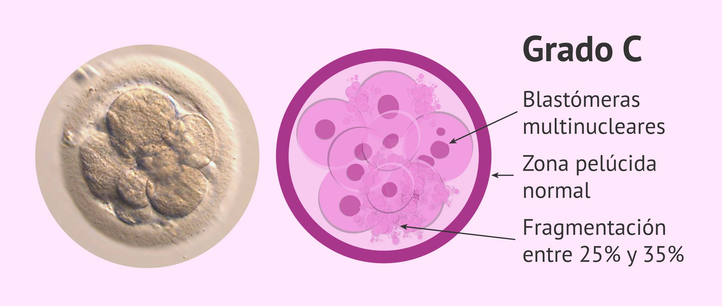 Los embriones de calidad C pueden presentar un número correcto de blastómeras o no, normalmente con asimetría y algunas blastómeras multinucleadas. El porcentaje de fragmentación se encuentra entre el 25 y el 35% y puede ser localizada o distribuida por todo el embrión. La zona pelúcida puede ser normal o presentar alteraciones en algunos casos.