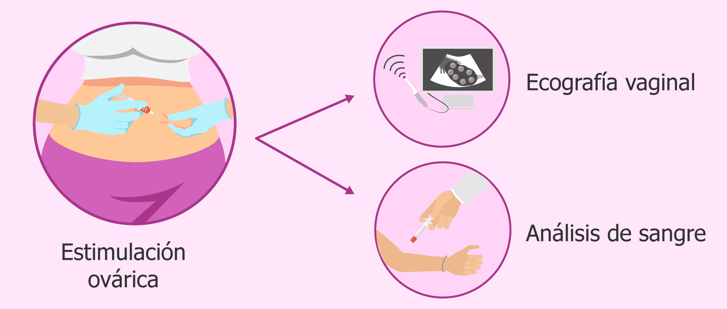 En la estimulación ovárica la mujer recibe una inyección subcutánea diaria de las gonadotropinas, las cuales actúan sobre el ovario favoreciendo el crecimiento y maduración de los óvulos. Para conocer el momento exacto de la ovulación y evitar el embarazo múltiple, se deben hacer varios controles ecográficos y analíticos.
