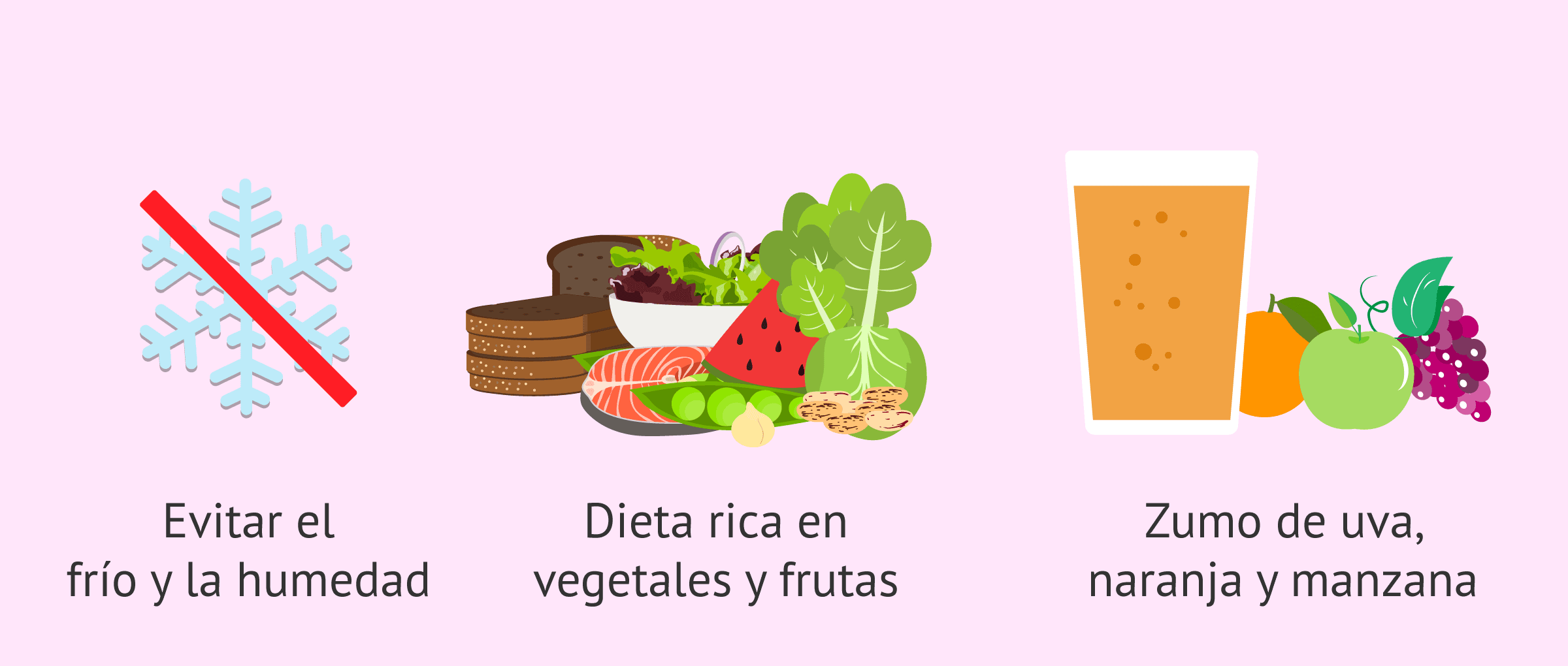 Por ejemplo, un consejo es evitar el frío y la humedad en la zona pélvica, llevar una dieta rica en vegetales y frutas, tomar zumo de naranja, uva y manzana o realizar baños con agua fría en la zona ovárica.