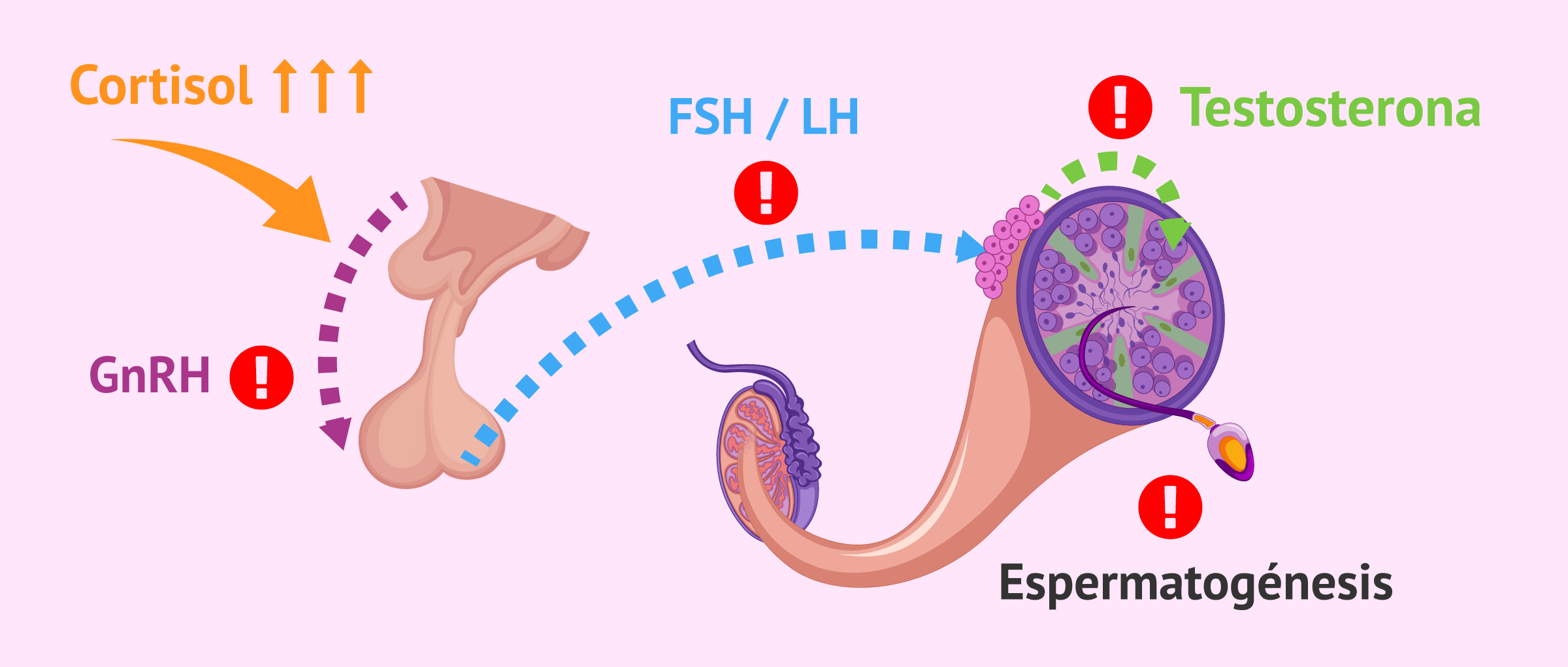 En un hombre con elevados niveles de estrés, se ha visto concentraciones elevadas de cortisol en sangre (la hormona del estrés). Las elevadas concentraciones de ésta, interactúan alterando la frecuencia de las pulsaciones de GnRH y, por lo tanto, desregulando el resto de hormonas del eje hipotálamo-hipófisis-testículo.