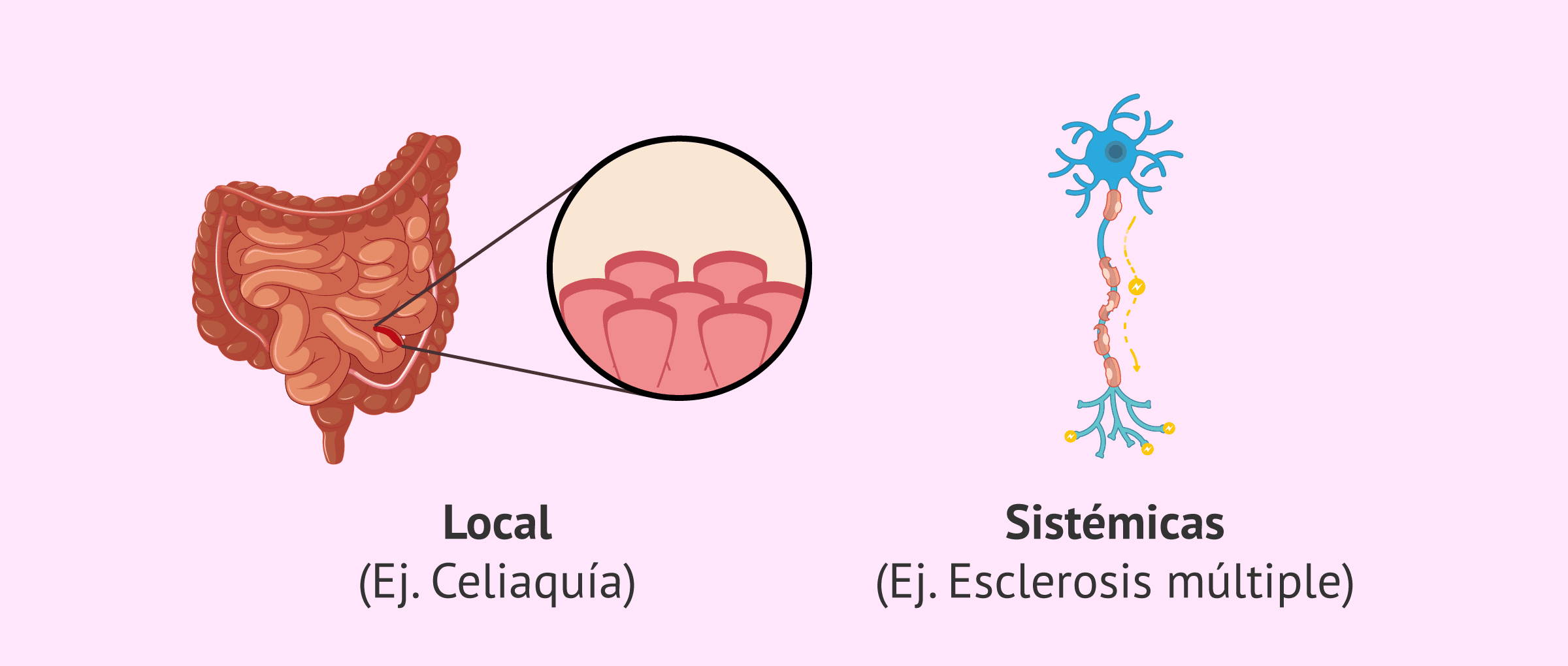 Existen dos tipos de enfermedades autoinmunes. Las enfermedades autoinmunes locales son aquellas que atacan a un órgano en particular como ocurre en la celiaquía. En cambio, las enfermedades sistémicas son las que afectan a varias zonas del organismo como por ejemplo la esclerosis múltiple.