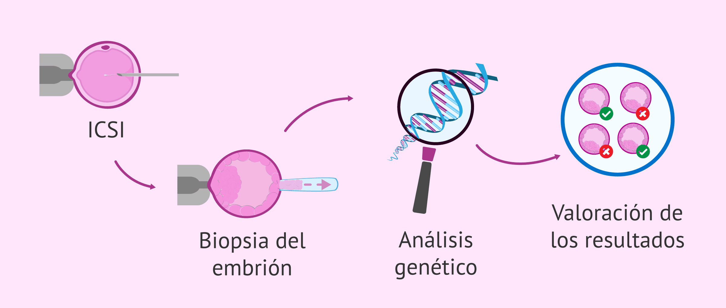 Para ello, se realiza una biopsia al embrión y se extrae una célula. Ésta será analizada genéticamente y se valorarán los resultados. Aquellos embriones alterados genéticamente no se transferirán. Los embriones clasificados como genéticamente sanos, se podrán transferir al útero de la mujer. Estos embriones tienen más posibilidades de implantar y dar lugar a un embarazo evolutivo que los embriones alterados.