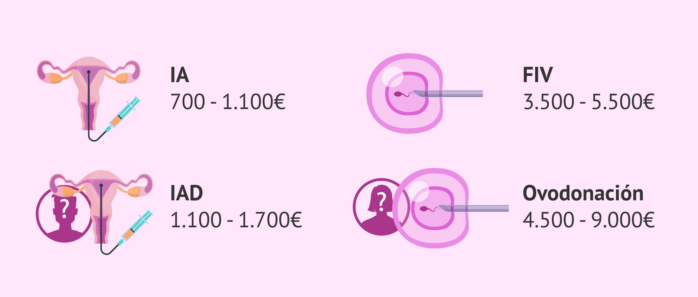 El coste de los tratamientos de fertilidad va a variar según la técnica de reproducción asistida y la procedencia de los gametos. La opción más económica es la IA con semen conyugal y su precio oscila entre los 700 y los 1.100 euros. En cambio, si la IA se realiza con semen de donante, su coste asciende a 1.100-1.700 euros.