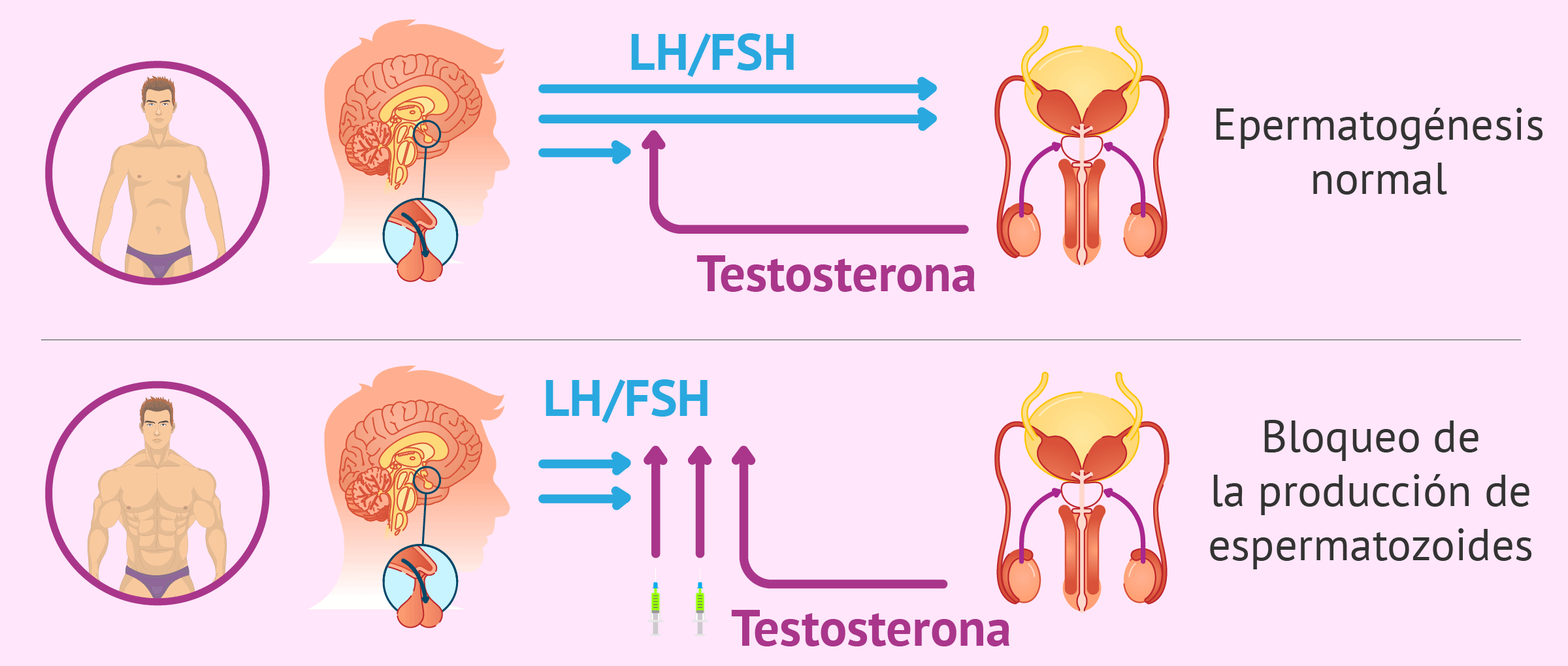La administración de esteroides anabólicos por vía oral o parenteral provoca un bloqueo continuo de la formación de espermatozoides debido a la alta concentración de testosterona. Por ello, estos hombres sufren esterilidad temporal.