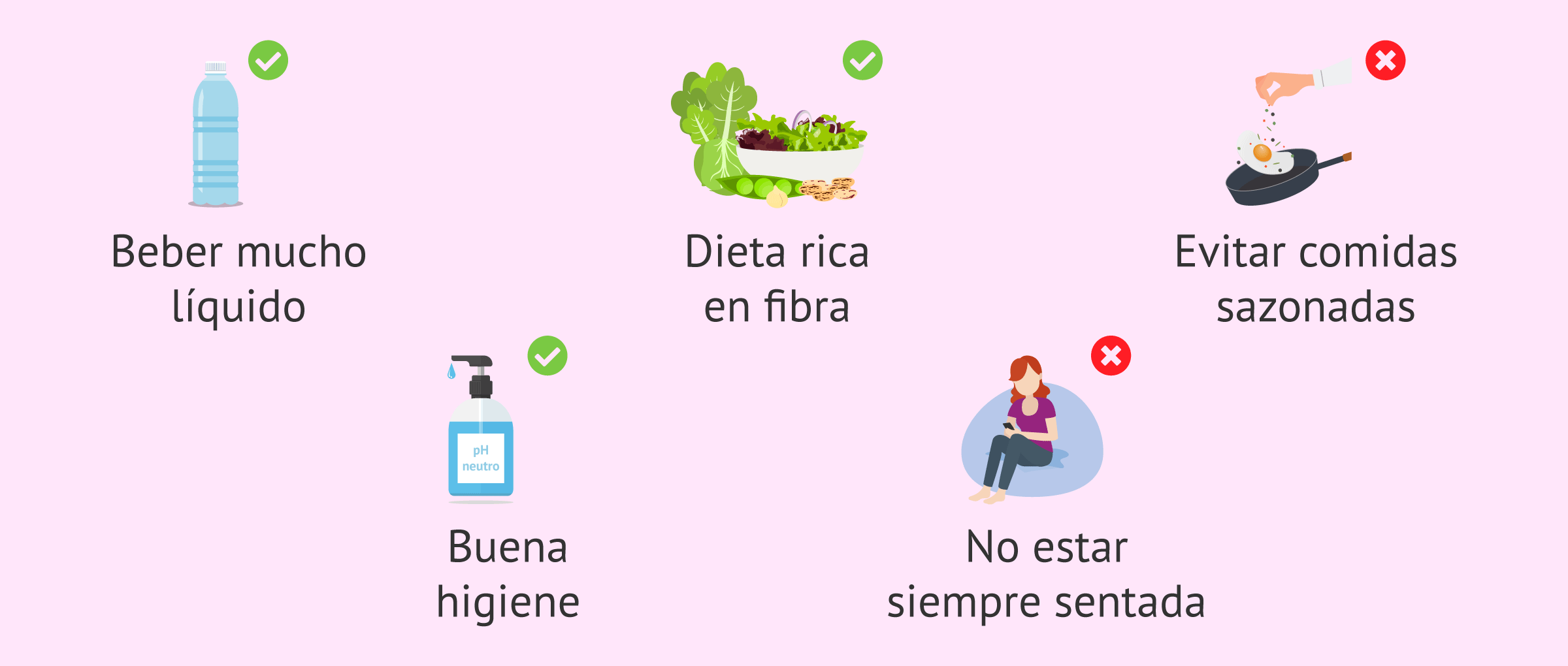Las hemorroides son una de las molestias más frecuentes que suelen aparecer al final del periodo de gestación. Una dieta rica en fibra, beber abundante líquido, cuidar el aseo personal en el baño y evitar llevar un embarazo excesivamente sedentario son algunas de las recomendaciones a tener en cuenta para sobrellevarlas de la mejor manera posible.
