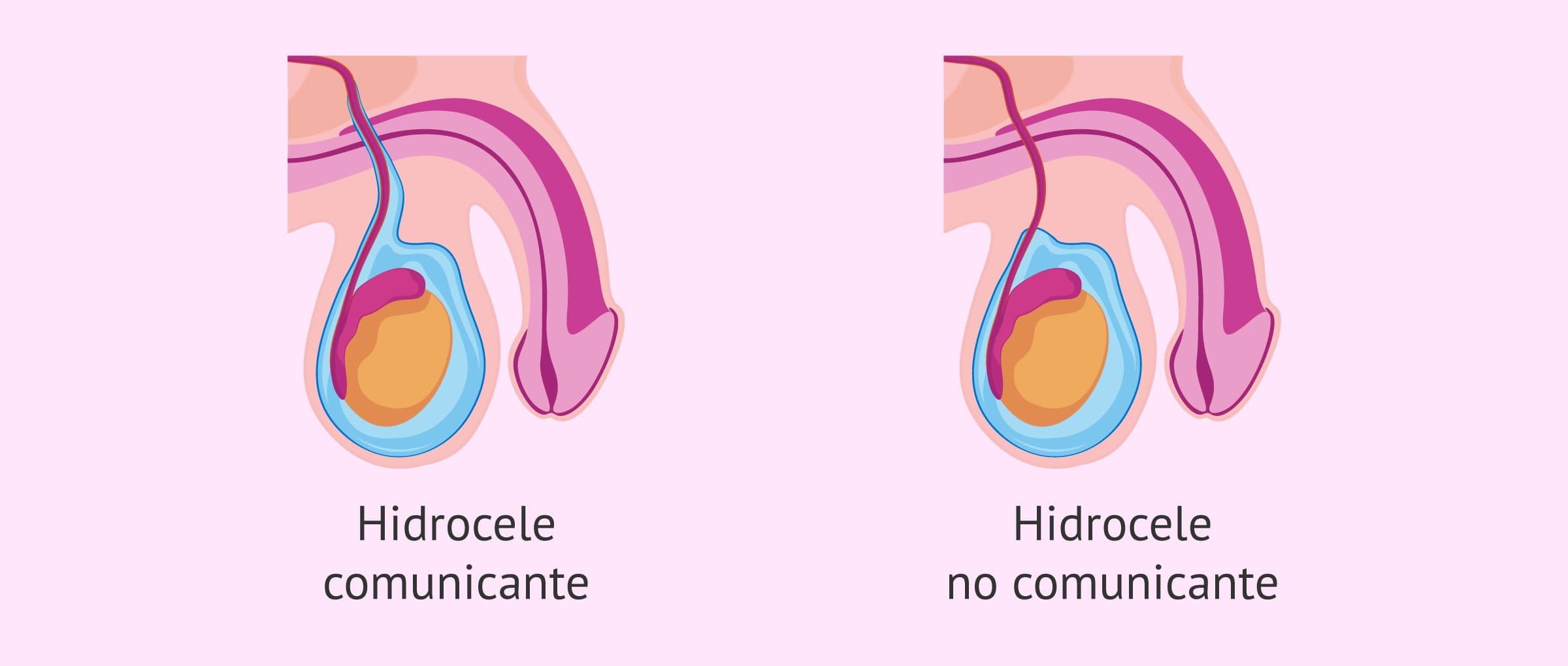 - Hidrocele congénito o comunicante. Este tipo de hidrocele aparece desde el nacimiento y es debido a un cierre incompleto de la túnica vaginal del testículo.