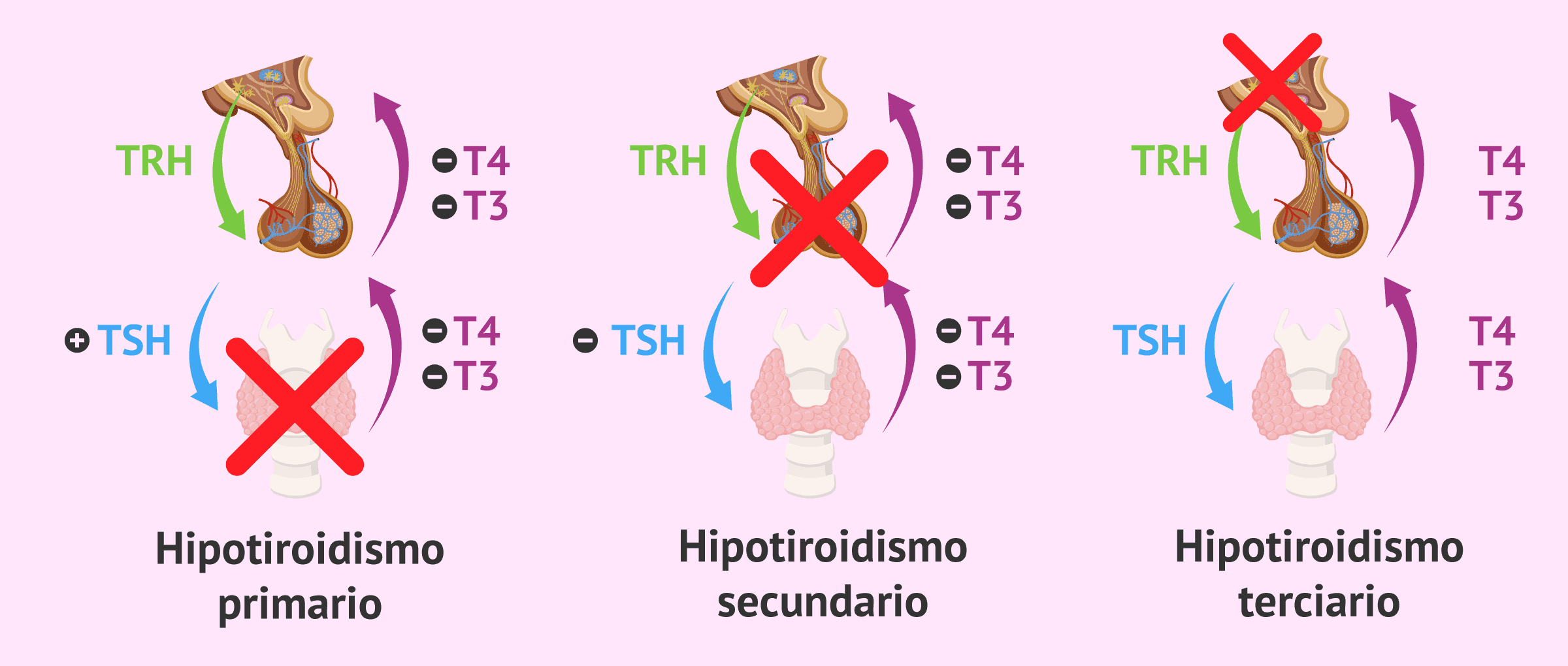 Según la región del eje hipotálamo-hipófisis-glándula tiroides que se encuentre dañado, existen tres tipos de hipotiroidismo. En el hipotiroidismo primario, el fallo ocurre a nivel de la glándula tiroides, de modo que deja de producir hormonas T3 y T4. Para intentar compensarlo, la hipófisis incrementa su secreción de hormona TSH. Es la forma más frecuente de hipotiroidismo.
