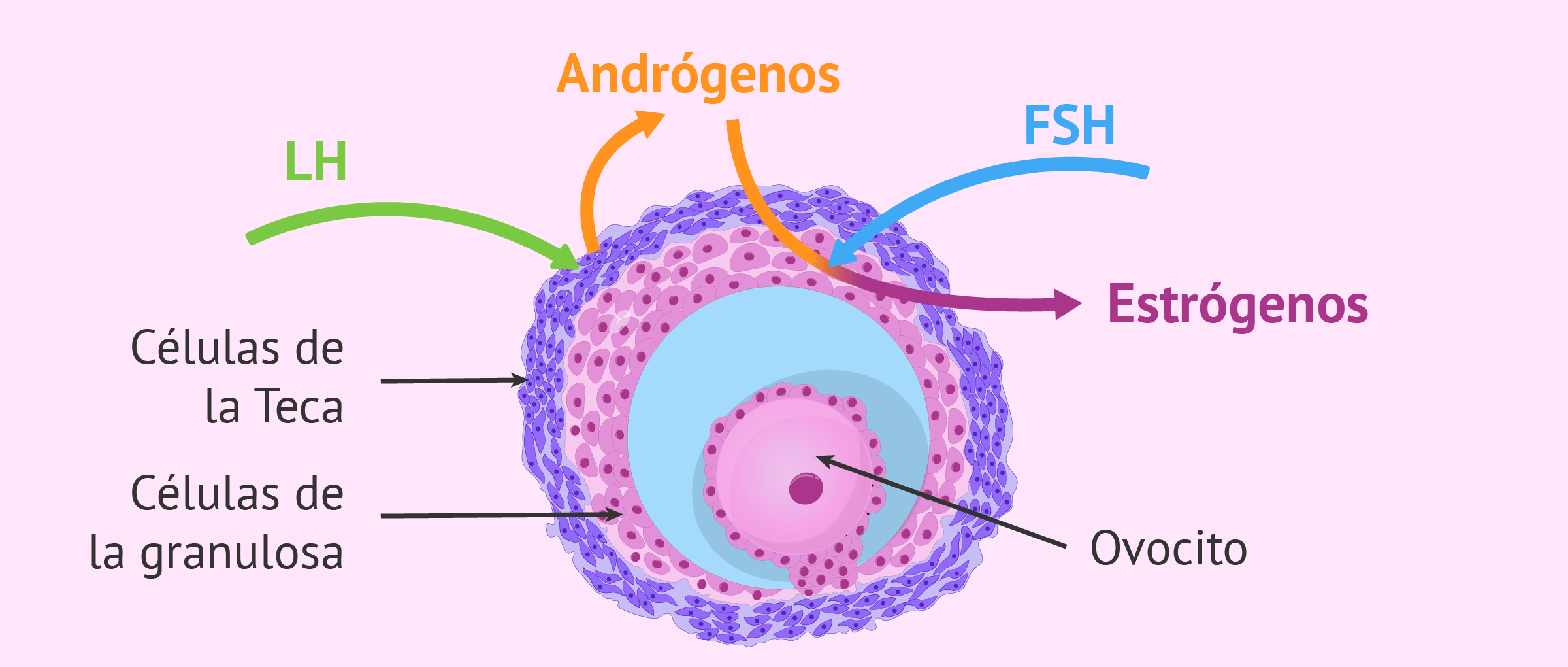 - A continuación, la FSH estimula la conversión de estos andrógenos en estrógenos en las células de la granulosa.