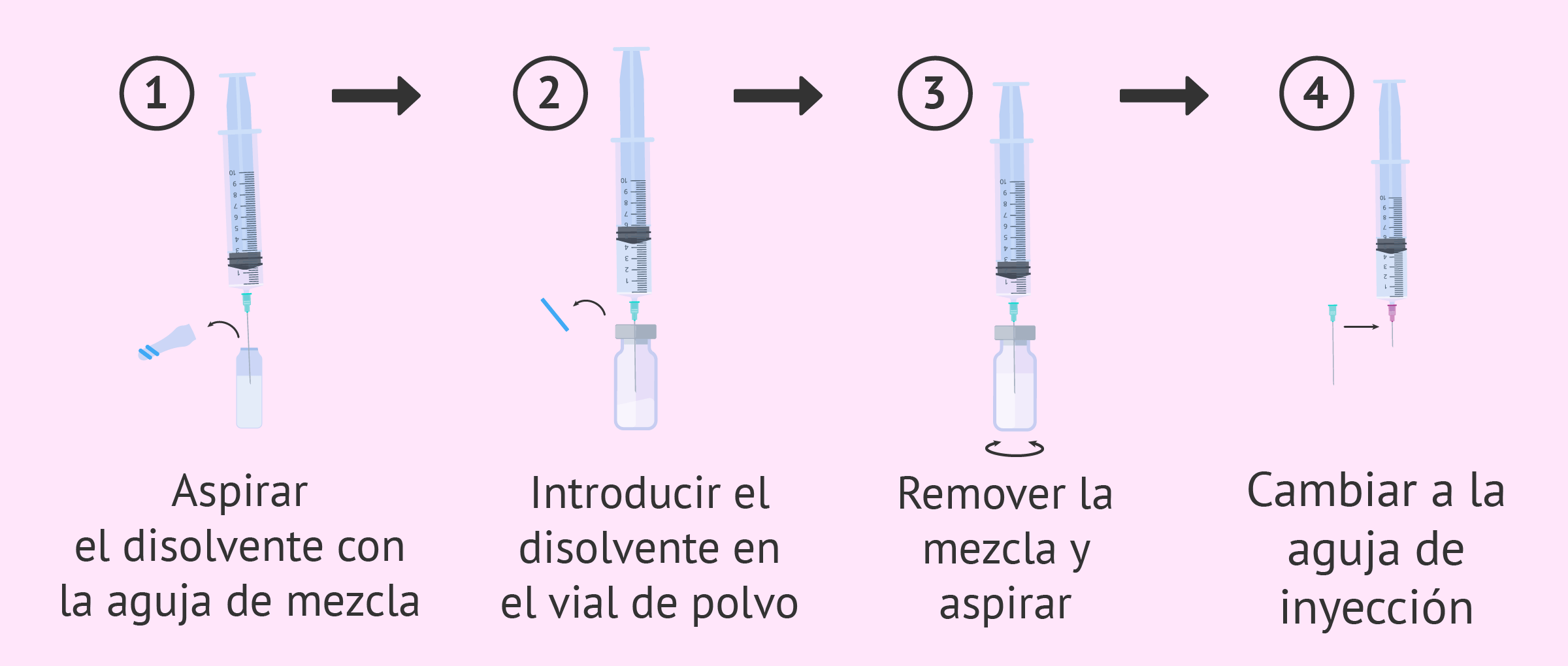 Antes de administrarse Menopur, es necesario que la paciente reconstruya el medicamento y prepare la inyección. En el caso de Menopur 75, cuyo formato es de un vial de polvo y un vial de disolvente, deben seguirse las siguientes instrucciones.