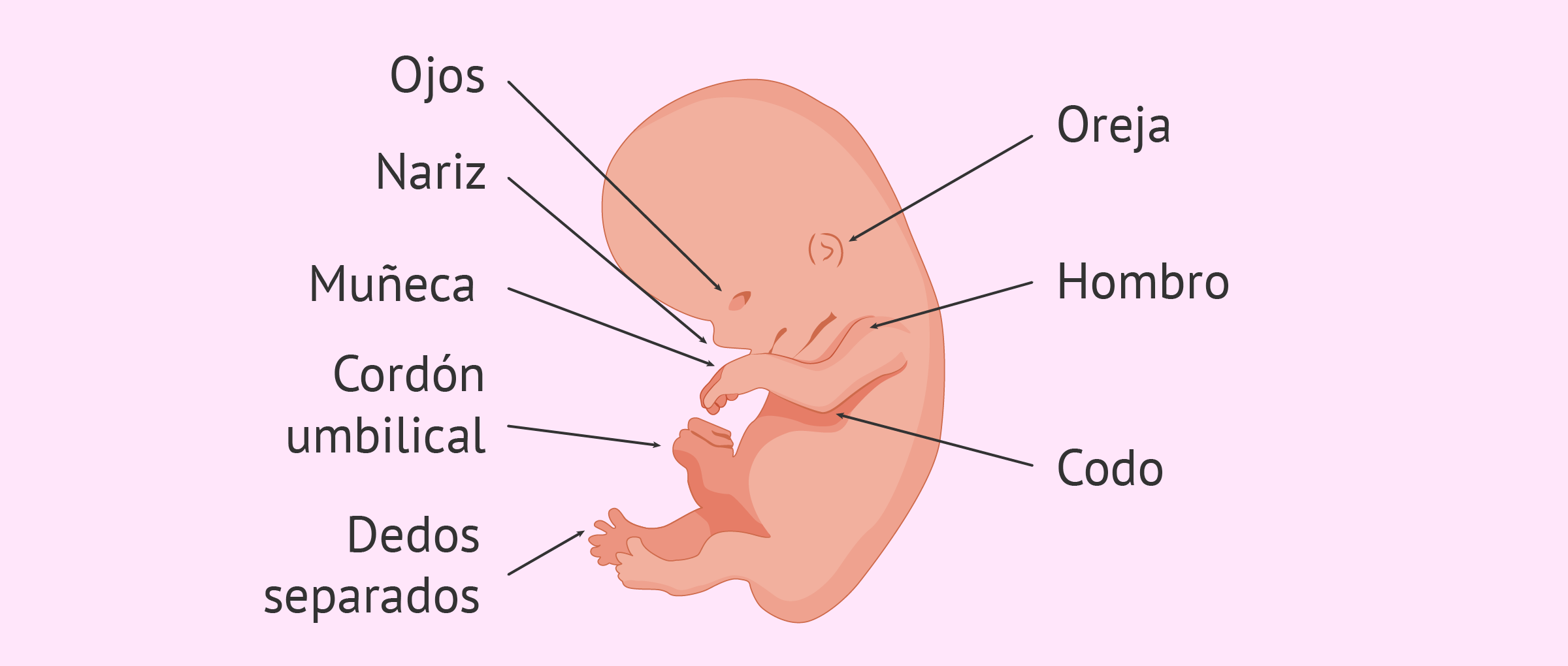 En los ojos aparecen los párpados, que por ahora permanecerán cerrados. La nariz y las orejas también empiezan a tomar forma normal.