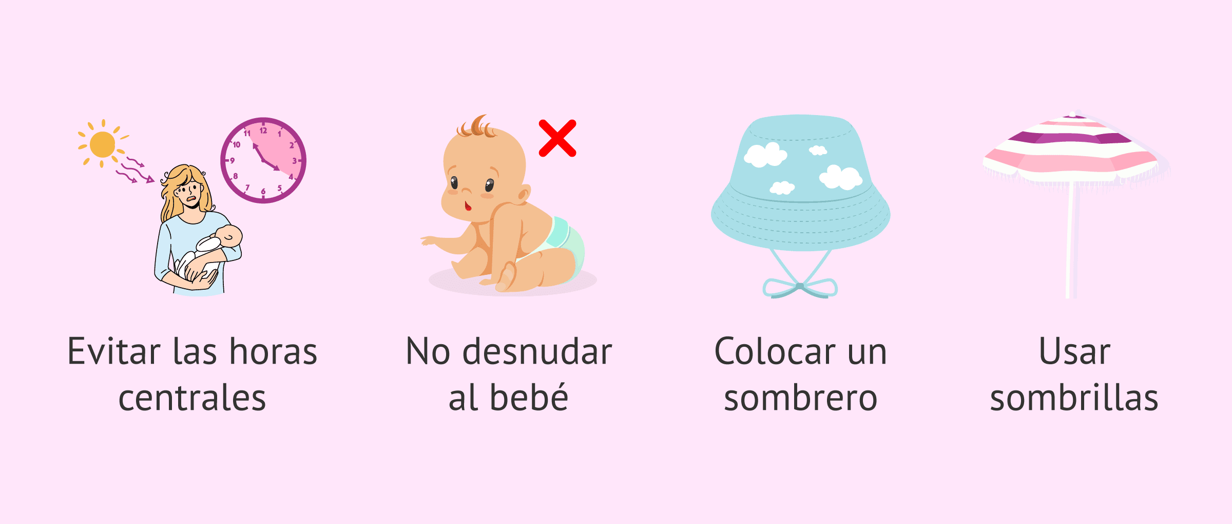 Además, en caso de estar en la piscina o en la playa, no se aconseja desnudar al bebé. Lo que hay que hacer es vestirlo y colocarle un gorro para proteger su cabeza del sol. También se recomienda buscar zonas de sombra y/o usar sombrillas.